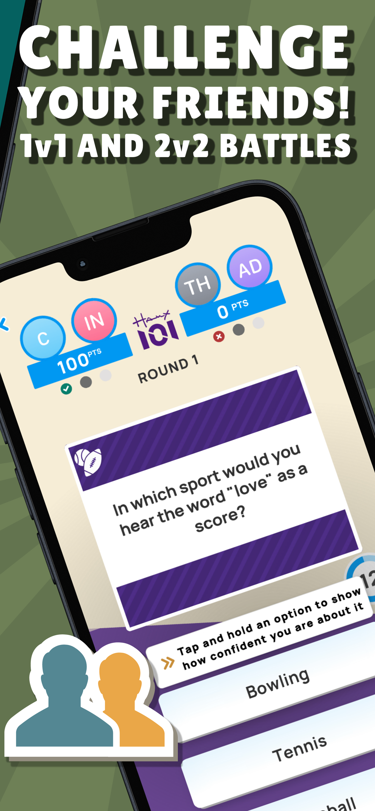 Enjoy all the timeless fun of trivia, but with exciting gameplay twists. When challenging an opponent in 1v1 or 2v2 multiplayer, you can use wildcards to get an edge over the competition. Wildcards allow you to introduce questions from your strongest topics into the competition, grant bonuses to your team, or even punish opponents for their mistakes!